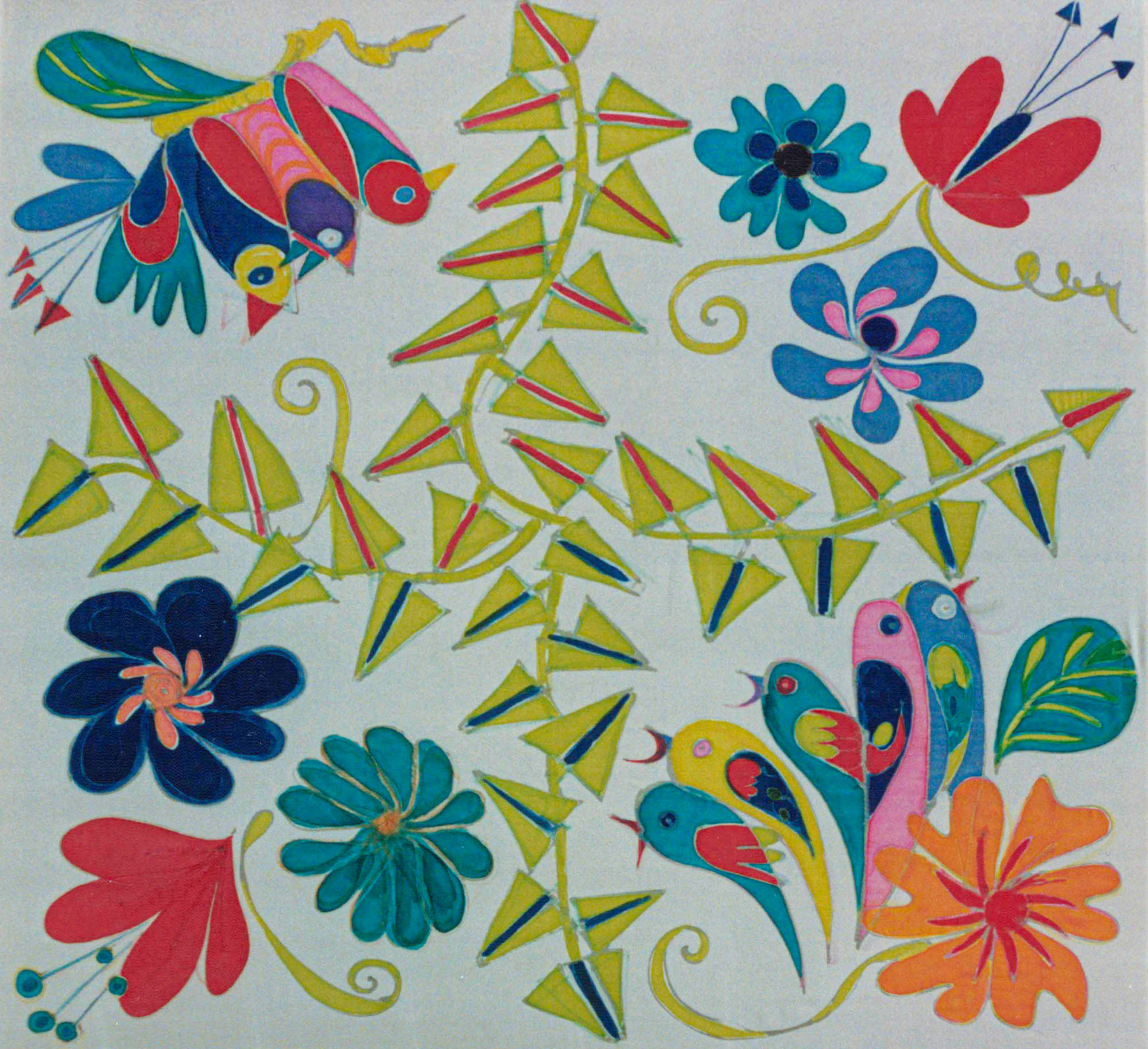 Sjaal bloemen en vogels - Textiel/Batik, Diversen 1996 (50 x 50 cm)